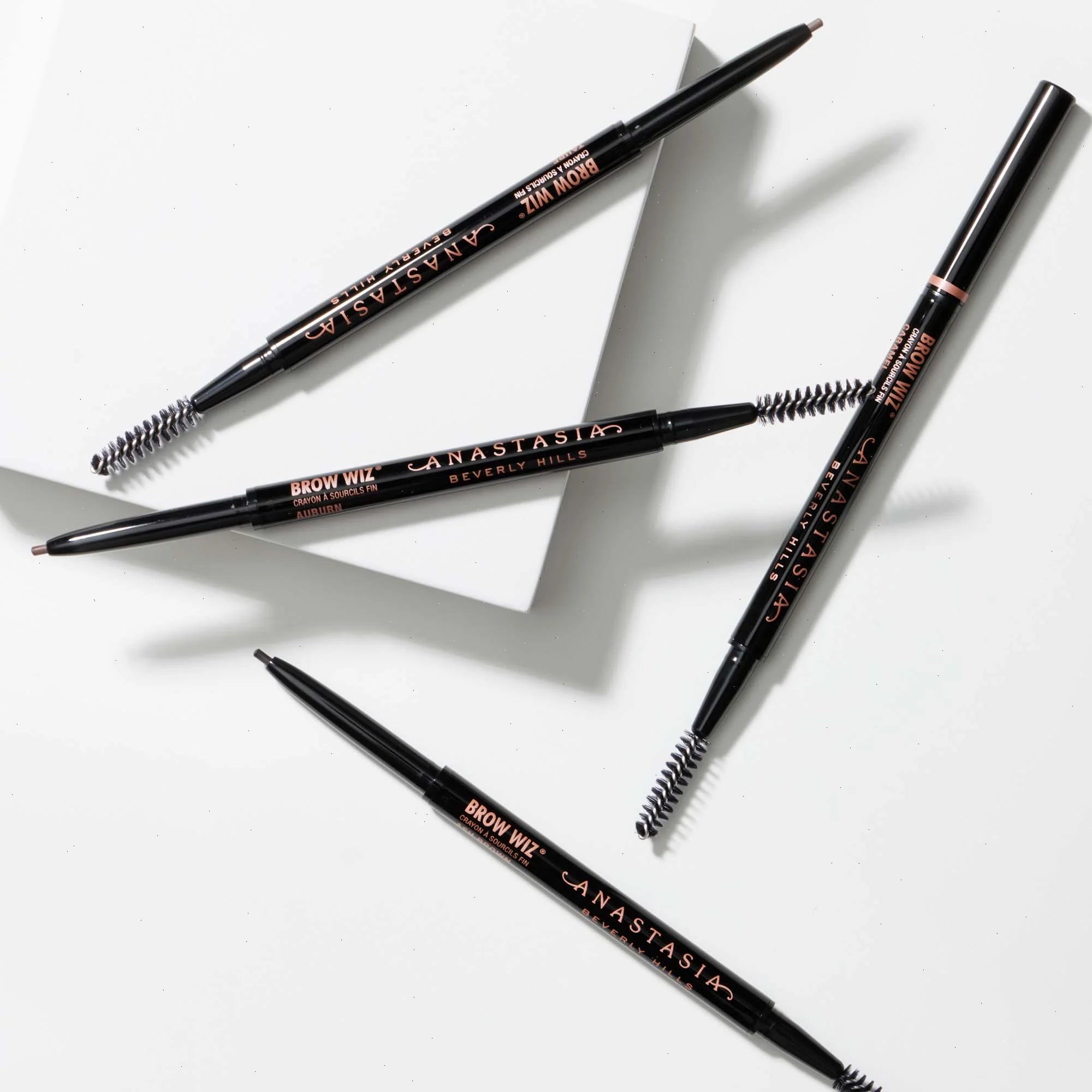 Anastasia Beverly Hills Brow Wiz® is an ultra-slim, retractable eyebrow pencil that is designed to add definition and hair-like detail to the eyebrow with maximum precision and control. Available in 12 shades, the unique wax formula features a perfect blend of eyebrow color and wax to deliver a high color payoff and mimics the look of hair-like texture for a natural-looking eyebrow. The ultra-fine, 1mm tip creates hair-like strokes in sparse areas of the eyebrow, while the custom spoolie brush blends for a natural-looking finish.