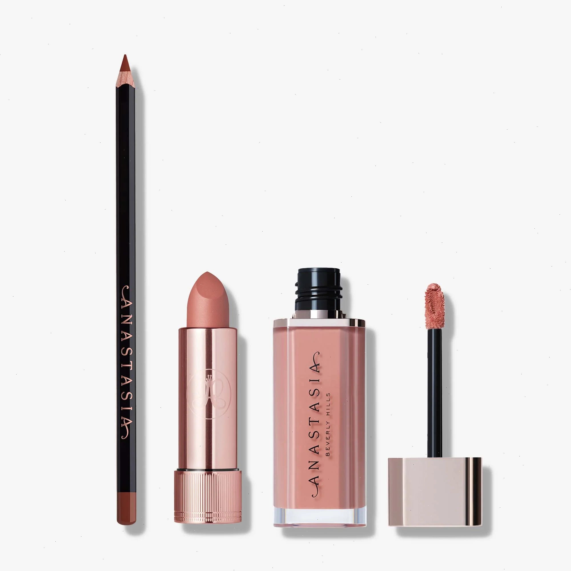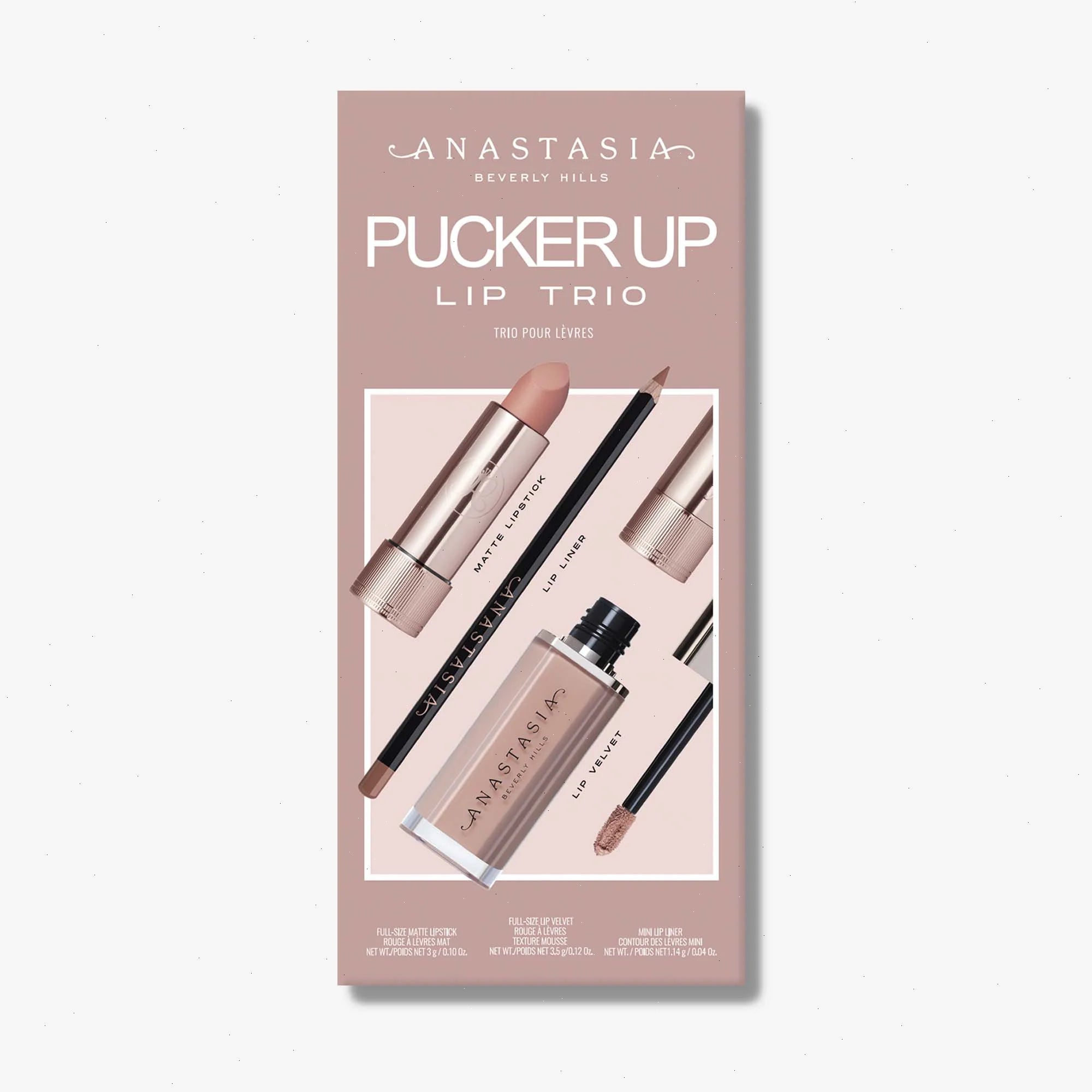 Full-pigment lip essentials. Mini Lip Liner offers extreme-precision to effortlessly shape, sculpt, and contour. Full-size Lipstick provides lip color with a smooth, matte finish, and Full-size Lip Velvet offers weightless, true-matte color, cushioned comfortable wear, and a smoothing lip finish.